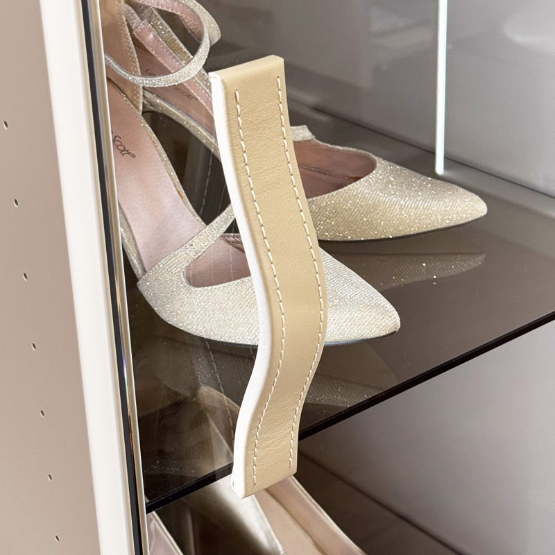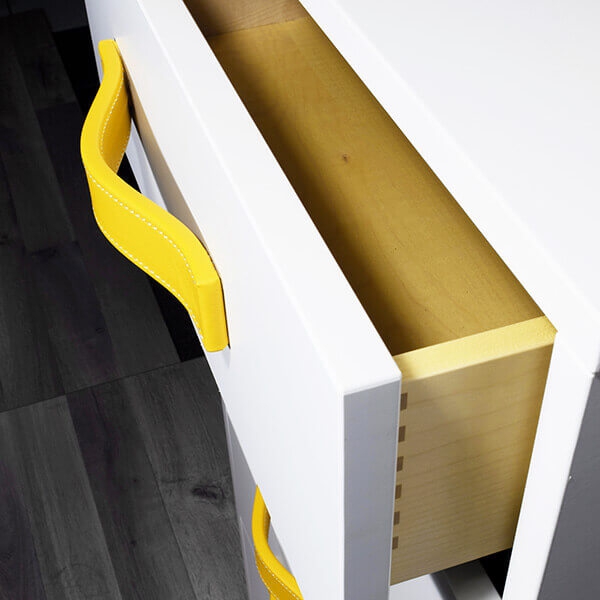 Personalize your high-end cabinet hardware by selecting from a wide range of leather and seam colors. Minimaro offers a vast array of leather shades, from bold choices like turquoise or red to subtle hues that complement any décor style. Choose from thousands of variations to elevate your furniture effortlessly. Visit our IMPRESSIONS page for inspiration on combining handles with furniture.